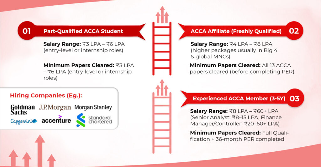 In India, fresh ACCA affiliates typically start at ₹3–7 LPA, depending on city and sector. Smaller firms offer ₹3–6 LPA, while Big 4 or global-captive roles can begin around ₹6–8 LPA. Salaries rise with experience: mid-level (3–5 yrs) often see ₹8–15 LPA, and senior ACCAs (finance managers, controllers) can command ₹20–60+ LPA. Abroad, ACCA salaries are higher in absolute terms (e.g. £25–35k in UK, $50–60k in US for entry-level). Many top MNCs and Big 4 firms actively recruit ACCA students/affiliates (even before full qualification) because the IFRS skillset is in demand. Overall, ACCA-qualified professionals enjoy strong earning potential globally as well as in India.