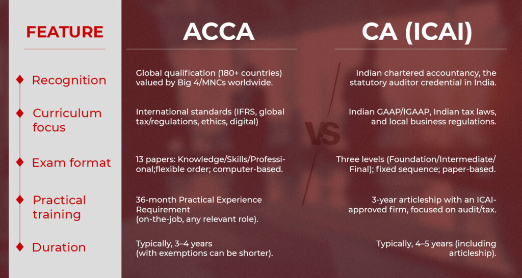 ACCA and the Indian CA (ICAI) qualification have different goals. ACCA is internationally focused (IFRS, global tax/business) vs CA’s India-centric (IGAAP, Indian tax law). ACCA allows modular study (any order, multiple sittings per year), whereas CA has fixed levels and a 3 year articleship. As a result, ACCA is generally faster (3–4 years) and more flexible; CA takes 4–5 years with mandatory work experience. ACCA covers broader finance roles (audit, reporting, analysis, advisory) with global mobility, while CA specializes in Indian statutory audit, taxation and compliance. In short, choose ACCA if you want a global finance career and flexibility; choose CA if you aim for deep expertise in Indian practice (audit, tax) and the prestige of ICAI membership.